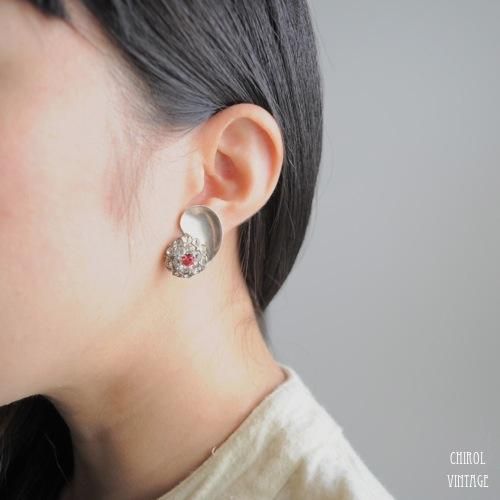 シルバーのドームに、透明感ある落ち着いた輝きのクリアグラスがグルーセットで埋め込まれ、トップにはルビーレットのストーンがアクセントにひと粒。