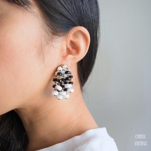 ブラックとホワイトのツートーンがシックな、ヴィンテージグラスのタッセルイヤリング。