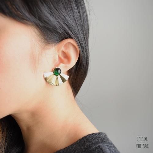 エメラルドグリーンのカボショングラスをアクセントに、ゴールドのジオメトリックなファンがボトムに広がったデザイン。