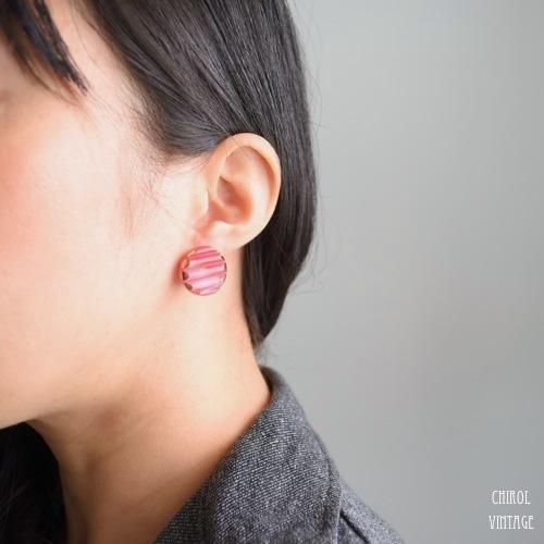 サテンピンク カットグラス ボタンイヤリング