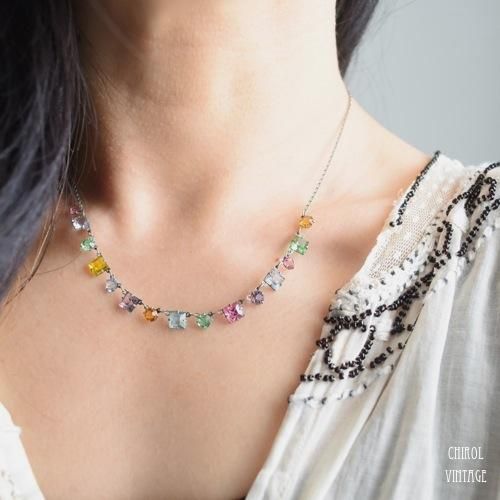 カラフルなパステルグラスがかわいい、オープンバックのデリケートなネックレス。