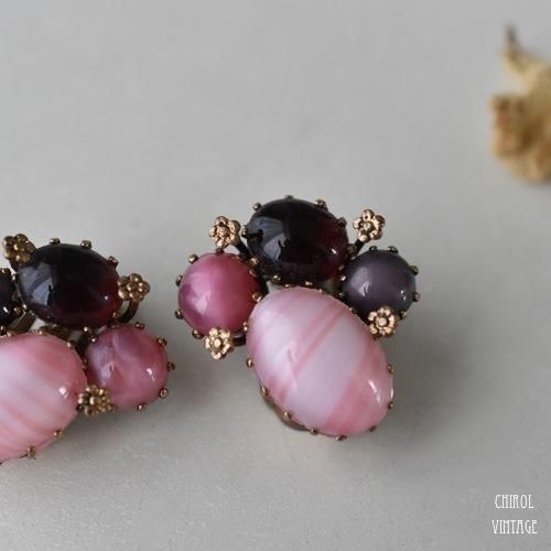 サテンピンクのストライプが入ったカボショングラスに、強めのピンク、ルビーパープル、モーヴカラーのカボショングラスが、それぞれしっかりとクロウセットされて、バランス良くアレンジされています。