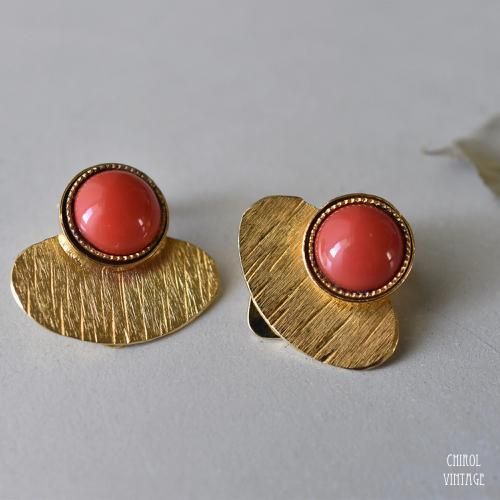 コーラルカラーのカボショングラスに、エッチングの施されたマッドなサテンゴールドのオーバルプレートが、初めて目にするユニークなデザイン。