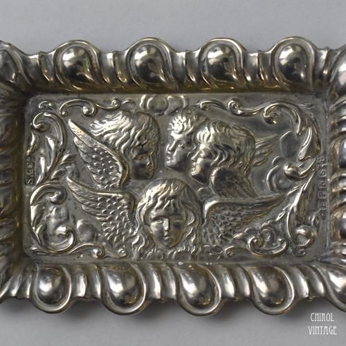 エンジェルのフェイスがエンボスされた、シルバープレートの小さなピントレイ。