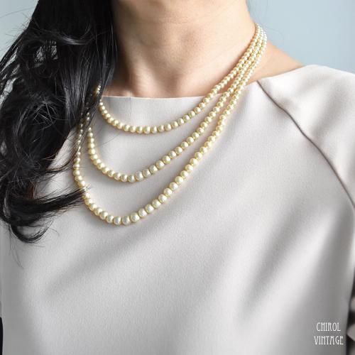 小さめのクリームパールが上品な、アールデコの3連パールネックレス。