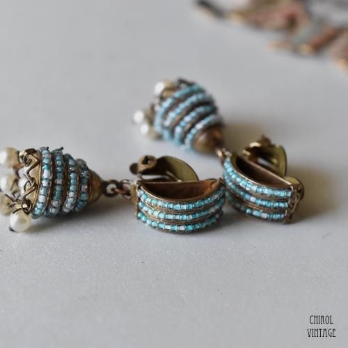 クリップ部分には、ハーフループになったブラスピースに、シードビーズが3列に編み込まれ、ふたつのパーツがそれぞれ存在感のあるリッチなデザイン。