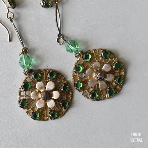 ペリドットグリーンのグラスがひとつあしらわれたピアスフックからは、メタルバーとダイヤシェイプのグリーンのグラスでフィリグリーがドロップし、ゆったりとスウィングします。