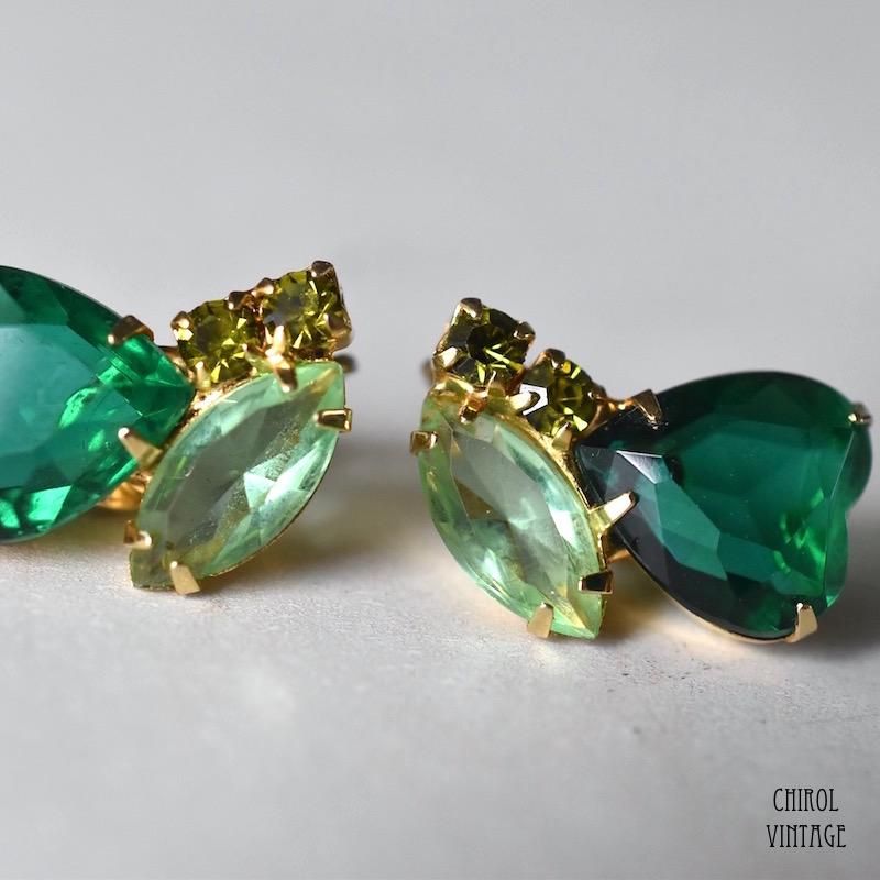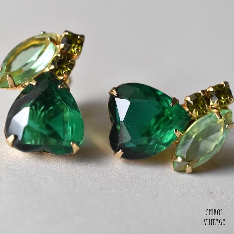 こちらは、エメラルドグリーンのハート、ペリドットグリーンのマーキスビジュー、スモーキーグリーンのラインストーンがセンスの良いカラーミックス。