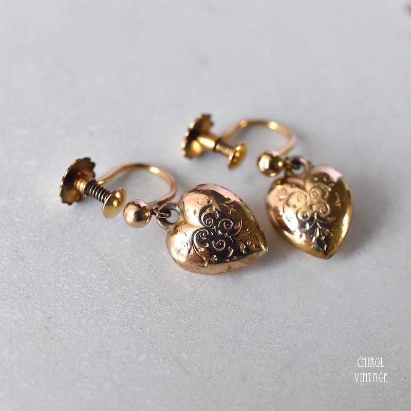 ロールドゴールドのパフハートがドロップした、ヴィクトリアンスタイルのスクリューイヤリング。