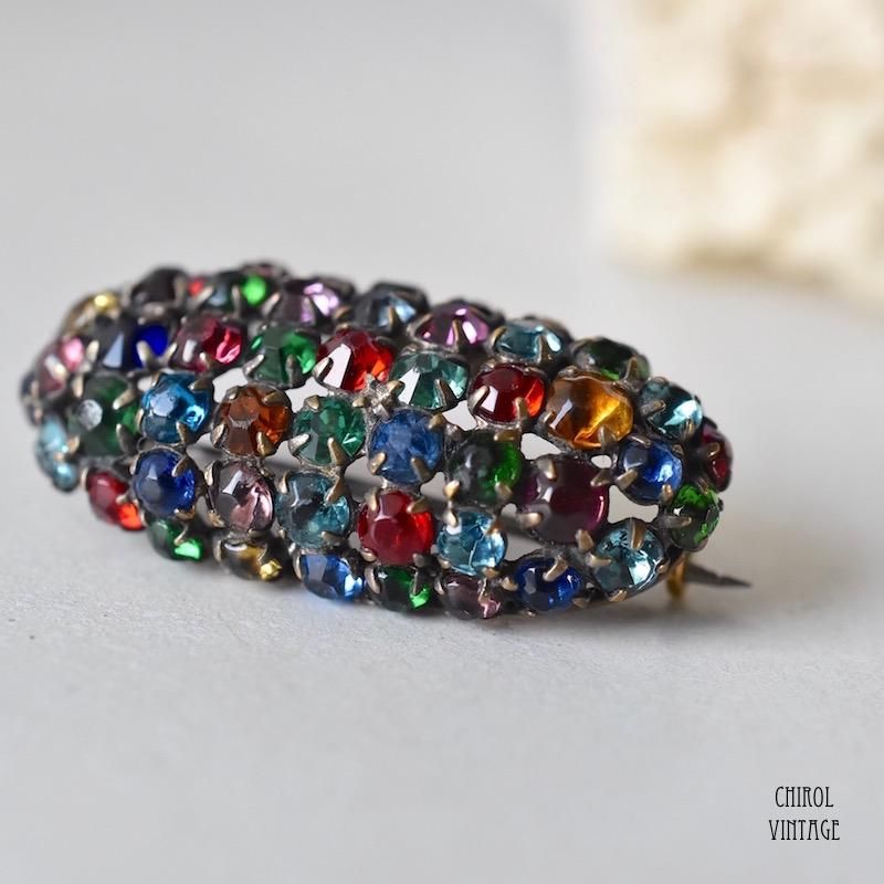 アールデコの時代に多く出回ったチェコグラスのブローチですが、こちらは年代ももう少し古く、他とは異彩を放つ存在感です。