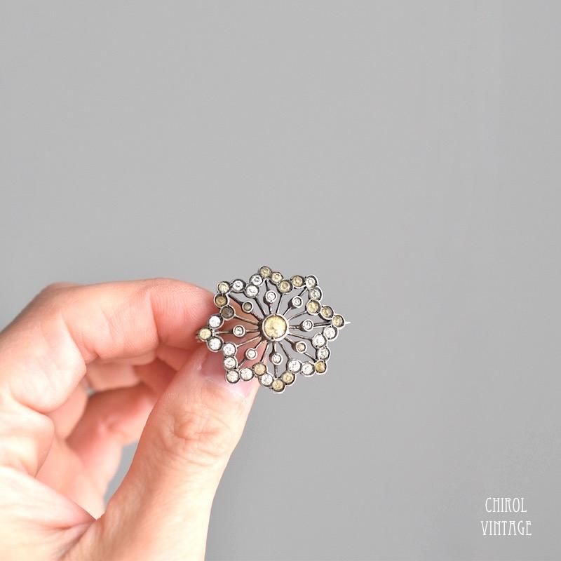 小さなクリアグラスが広がるように散りばめられた、可愛らしいデザインのブローチ。