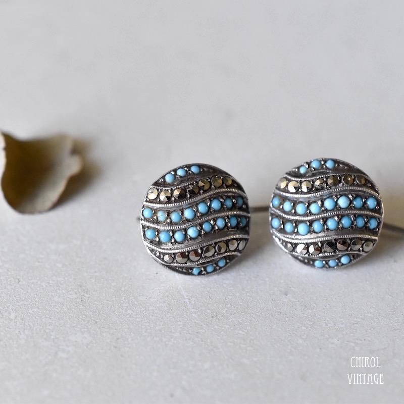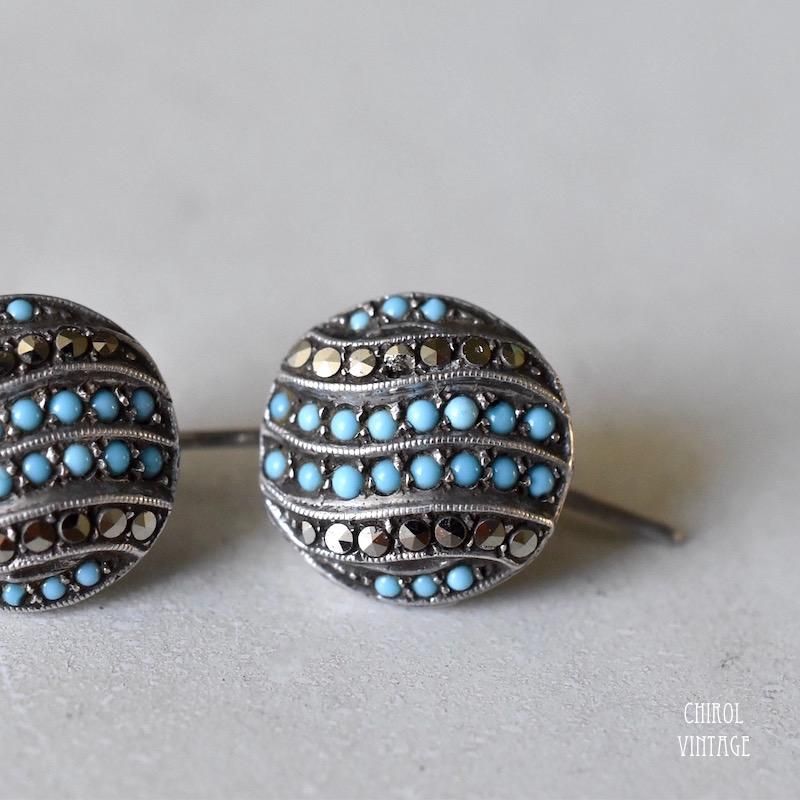 厚みのあるスターリングシルバーのドームに、小さなターコイズグラスとマーカサイトがびっしりと埋め込まれたデザイン。