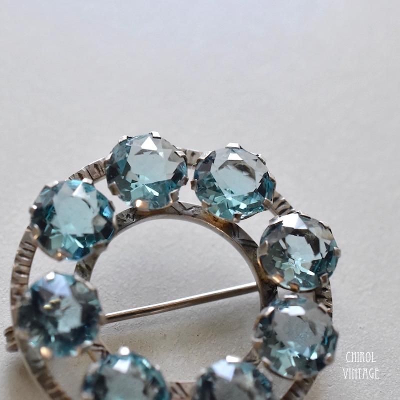 淡いアクアマリングラスの輝きが最高に美しい、スターリングシルバーのサークルブローチ。