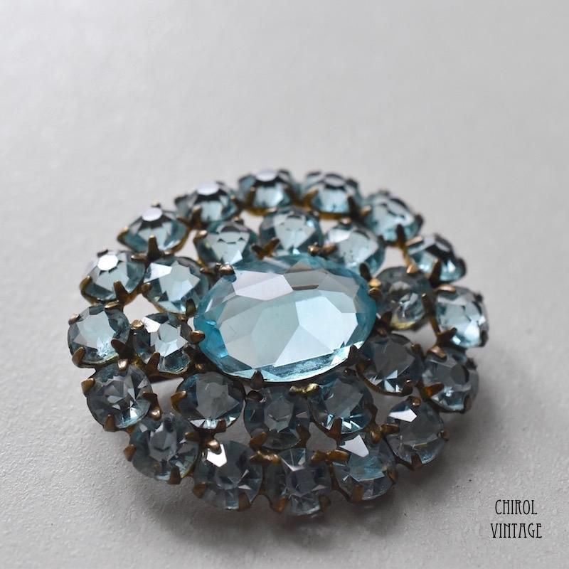 みずみずしく輝くアクアマリンカラーのグラスが美しい、チェコのアールデコブローチ。
