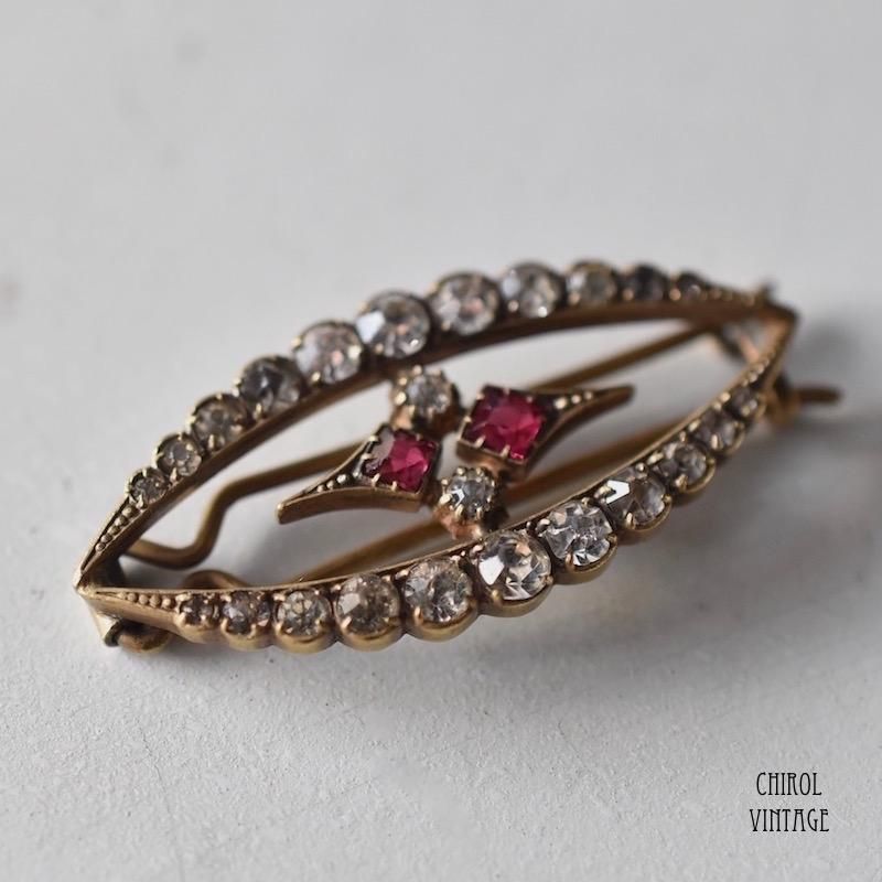 ゴールドトーンメタルのアイシェイプに、上品な輝きのグラスストーンが、ひとつひとつ小さな爪で丁寧にセットされ、センターにはスクエアのルビーグラスとクリアグラスがあしらわれています。