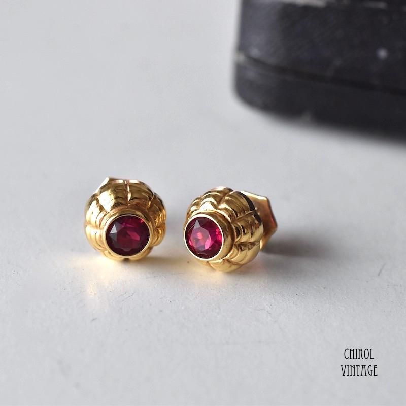 リッチなピンクルビーのグラスが、大人っぽく可愛らしさもあるデザインのスタッドピアス。