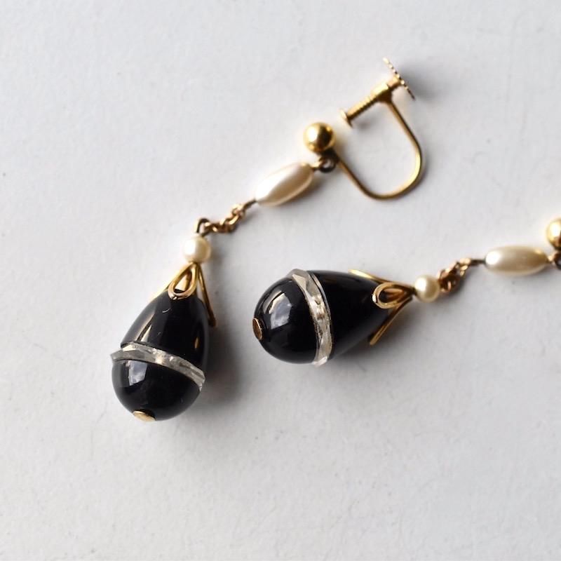 オニキスとロッククリスタルのコントラストが美しい、アールデコの9Kゴールドイヤリング。