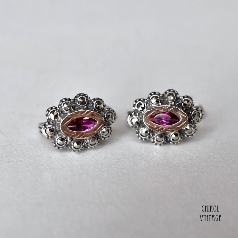 発色の良いピンクのグラスがセンターに輝く、クオリティ高いシルバーピアス。