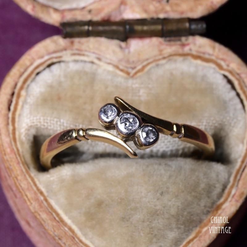 オールドカットの小さなダイアモンドが斜めに3つ並んだ、18Kゴールドのアンティークリング。