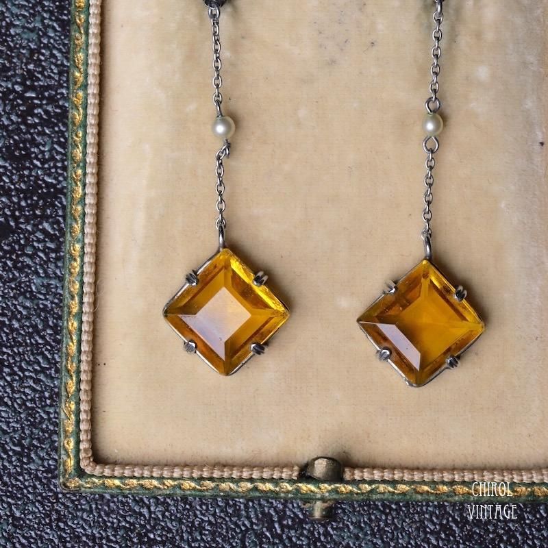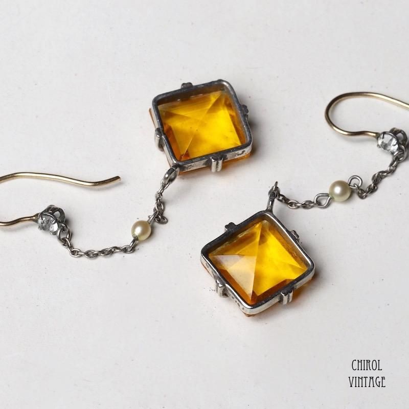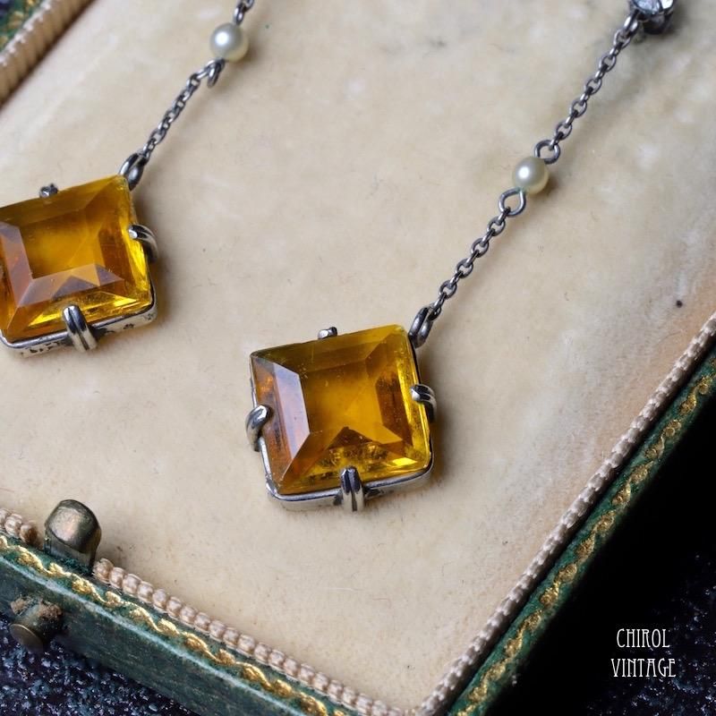 リッチなシトリンカラーのスクエアグラスがシルバートーンのチェーンでドロップし、間にあしらわれたグラス製のシードパールがアクセントとなったデザイン。