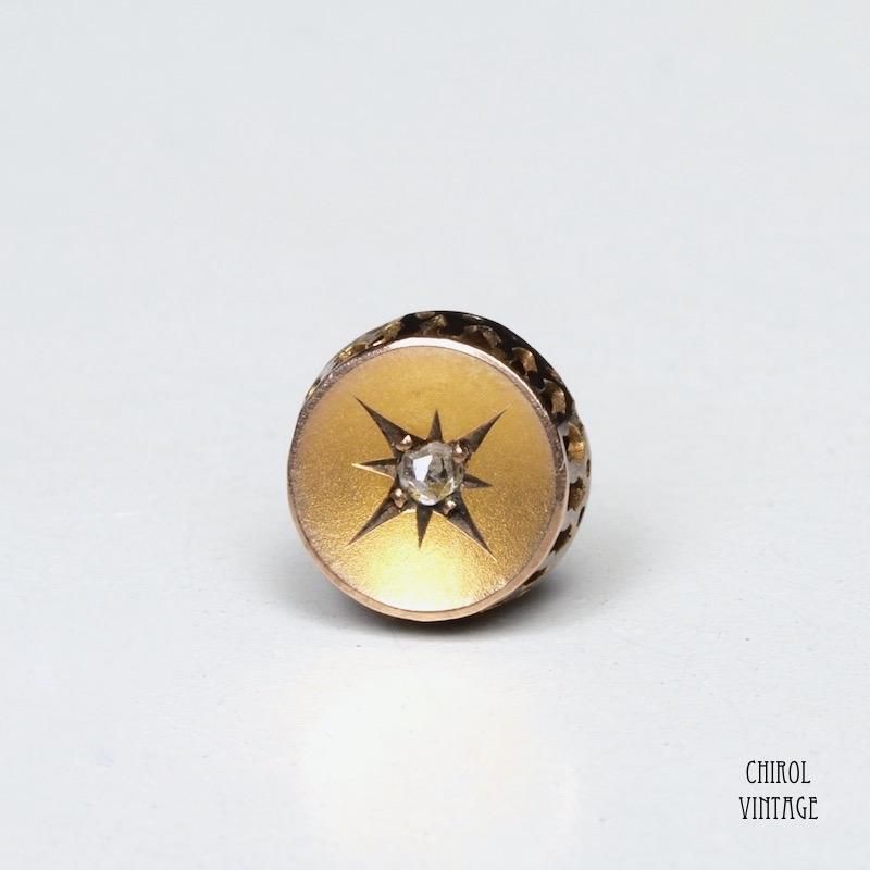 ラウンドの9Kゴールドのセンターに、ローズカットの小さなダイアモンドが一石輝くアンティークピアス。