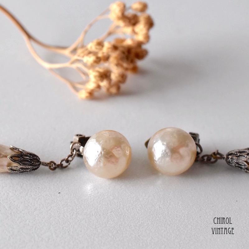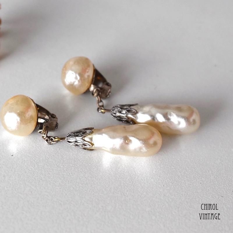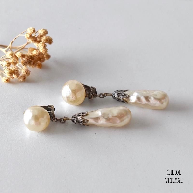 クリップ部分には、それだけで存在感のあるボリュームあるハーフパールがあしらわれ、短めのチェーンティアドロップのバロックバールがドロップしたデザイン。