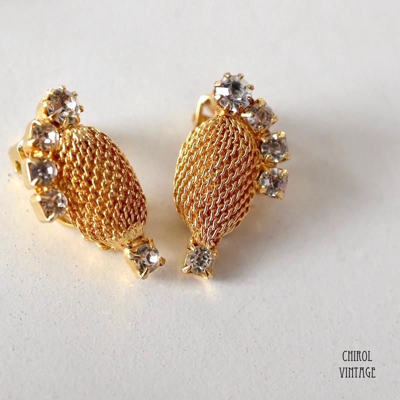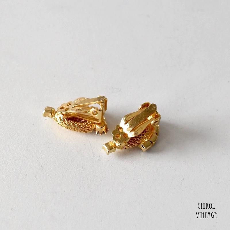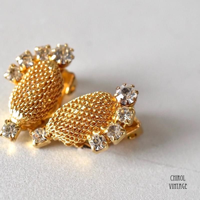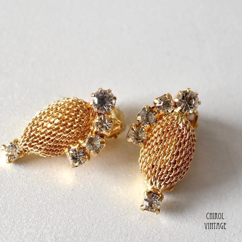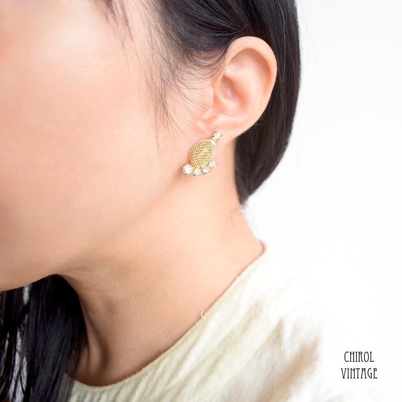 キャンディのような膨らみのあるゴールドメッシュのモチーフにクリアグラスがあしらわれた、ユニークなデザインのクリップイヤリング。