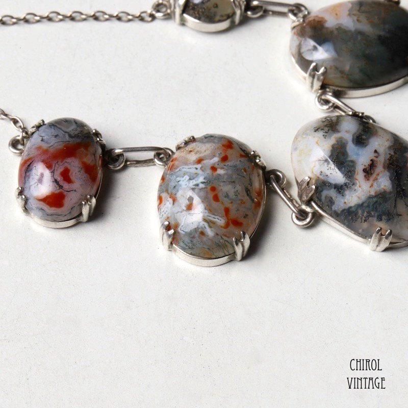 モスアゲートのカボションが贅沢にアレンジされた、アールデコのシルバーネックレス。