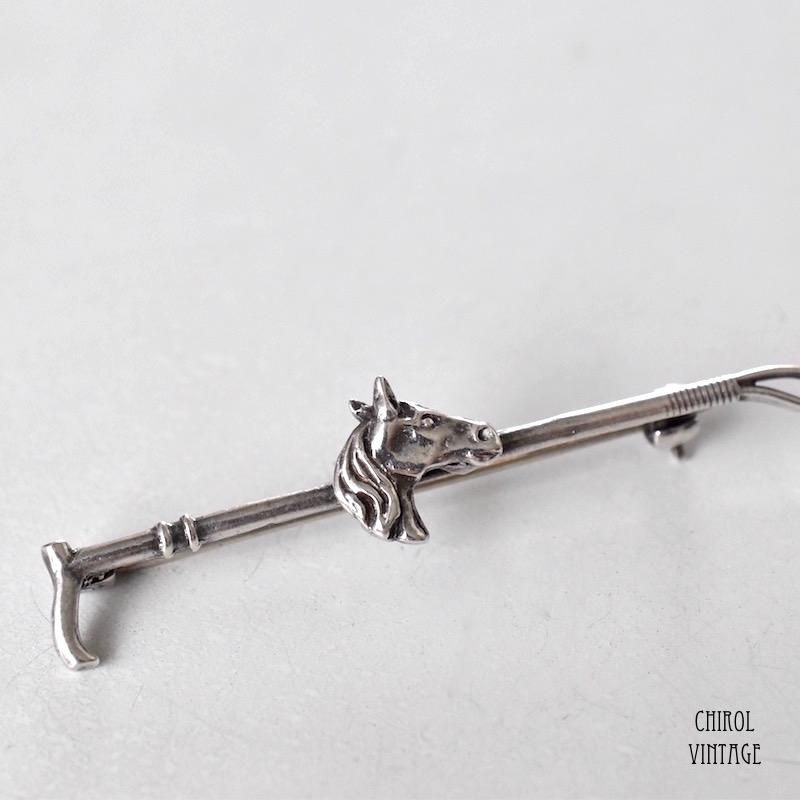 乗馬がモチーフになったライディングクロップのシルバーブローチ。