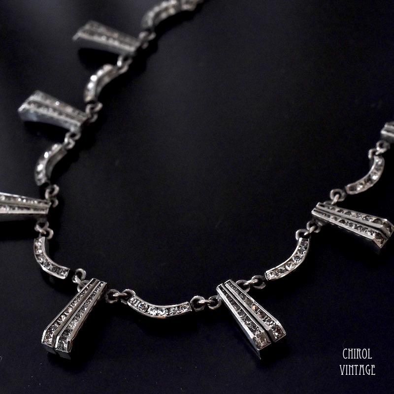 チャネルセットされたクリアグラスがフリンジになった、アールデコスタイルのネックレス。
