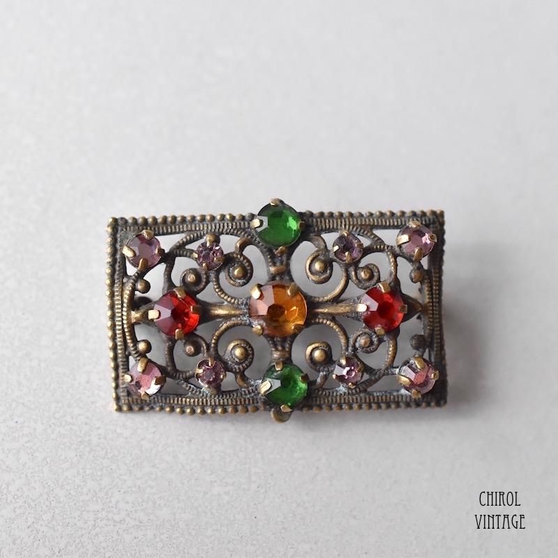 レースのように繊細ないぶしがかったフィリグリーに、オレンジ、レッド、ピンク、ミントグリーンのミラーバックのグラスが散りばめられたデザイン。