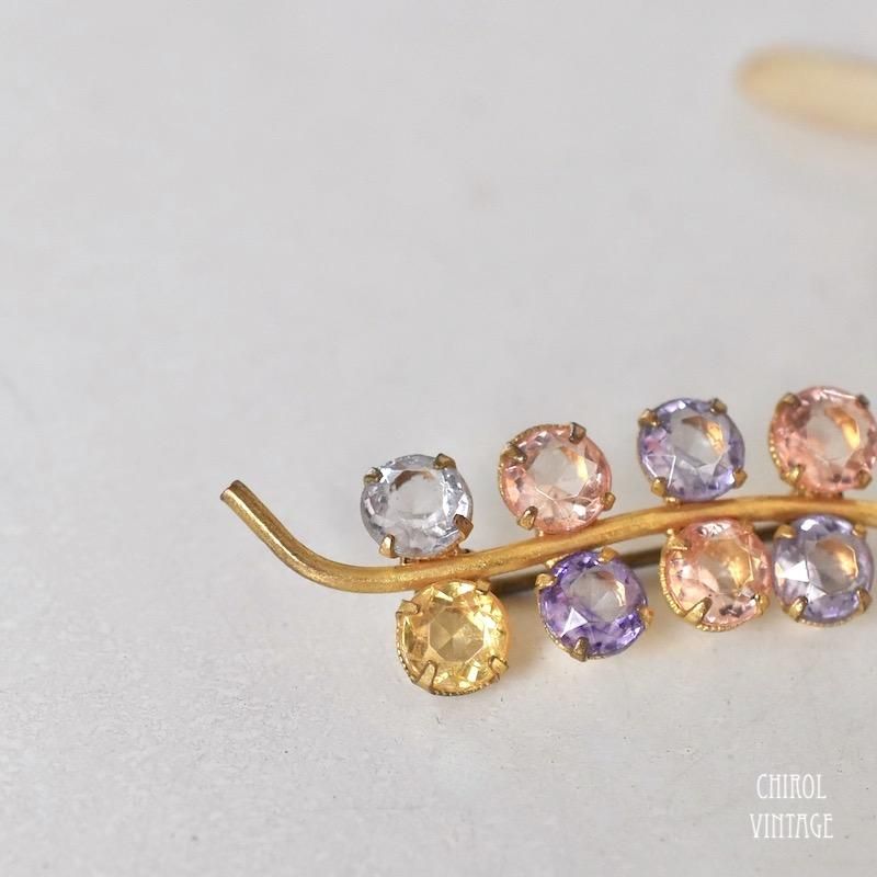 柔らかいパステルカラーのグラスが、キラキラと透明感よく輝くヴィンテージブローチ。