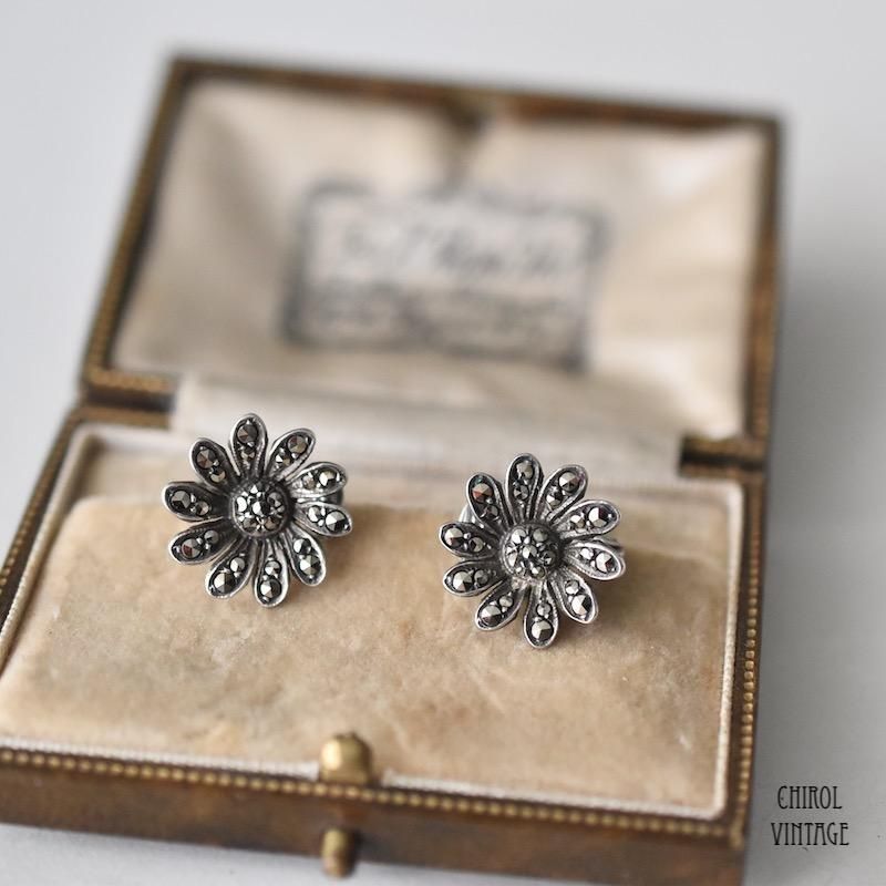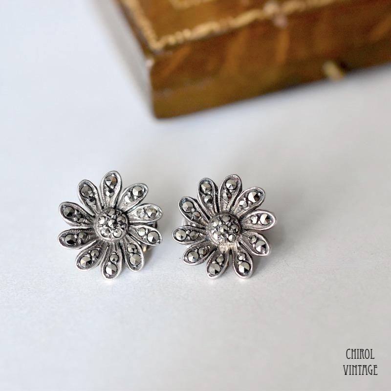 835シルバーに艶やかなマーカサイトが煌めく、小さなデイジーのヴィンテージイヤリング。