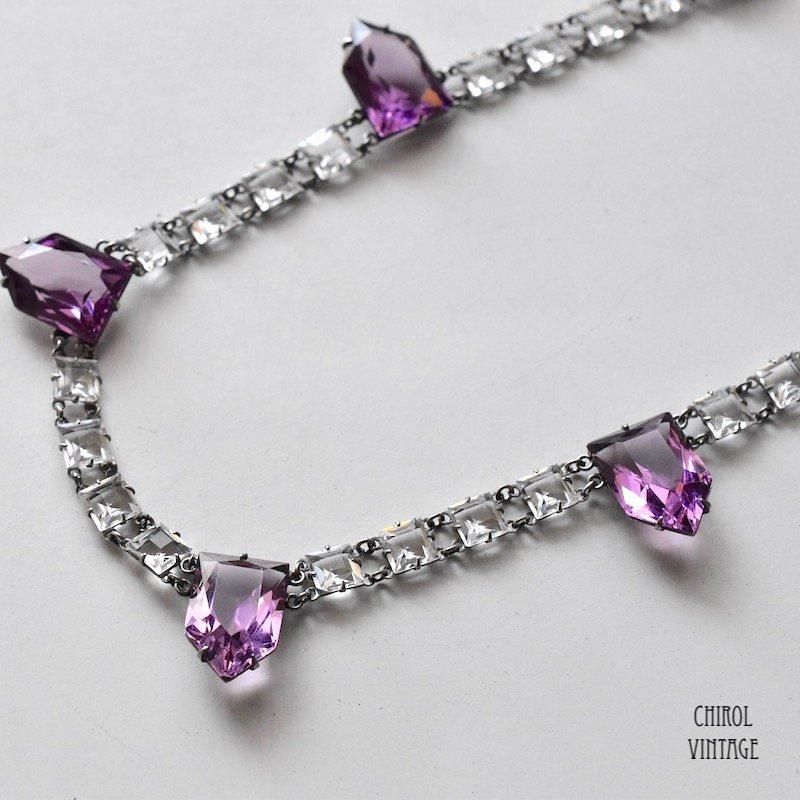 五角形のユニークなカットが施されたパープルのグラスとスクエアのクリアグラスが、首周りにくるりと一周あしらわれた、特に贅沢でレアなデザイン。