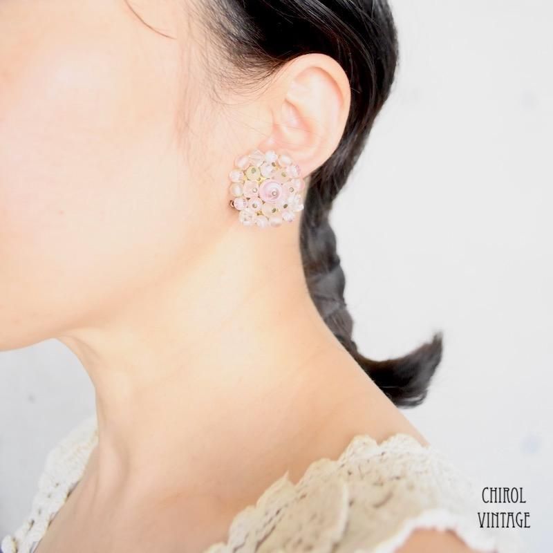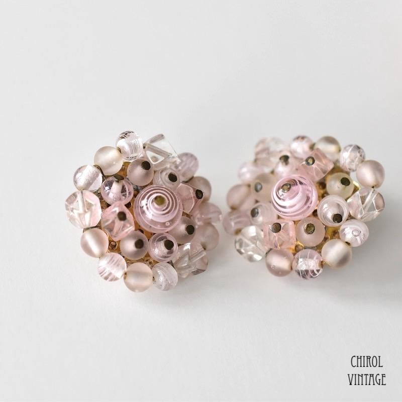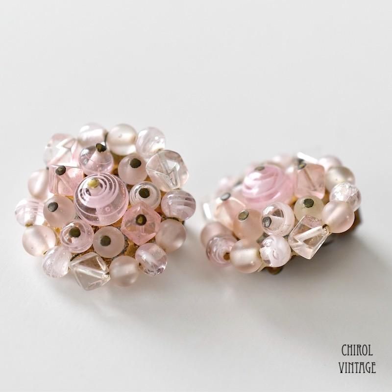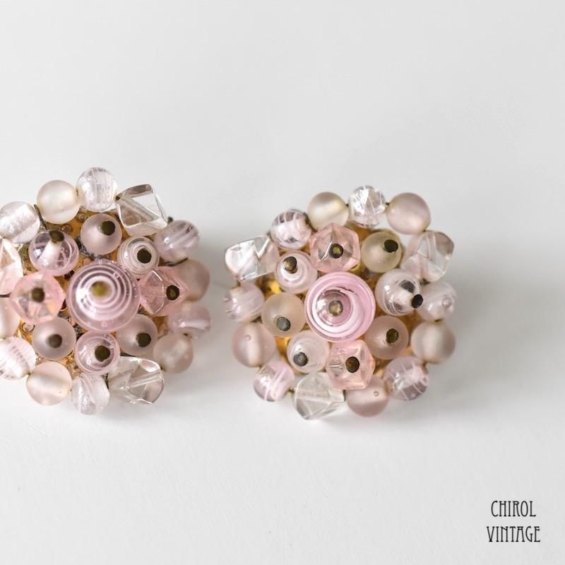 ピンクトーンのマルチグラスビーズがクラスターしたヴィンテージクリップイヤリング。