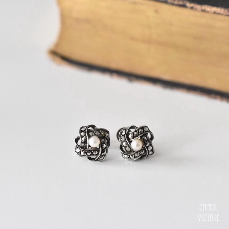 小さなリアルパールとマーカサイトを用いた、スターリングシルバーのヴィンテージイヤリング。