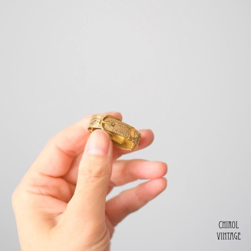 リングの前面には美しいアイビーのエングレイヴが手彫りで施され、ベルトバックルが立体的に仕立てられたデザイン。