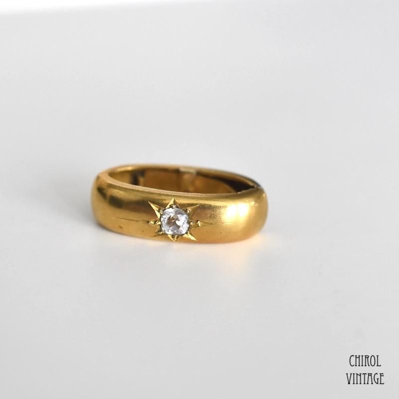 プレーンな厚みのあるゴールドメタルのリングに、通常よりも多面のファセットが施されたオールドカットのクリアグラスが一石、ジプシーセットで埋め込まれたデザイン。