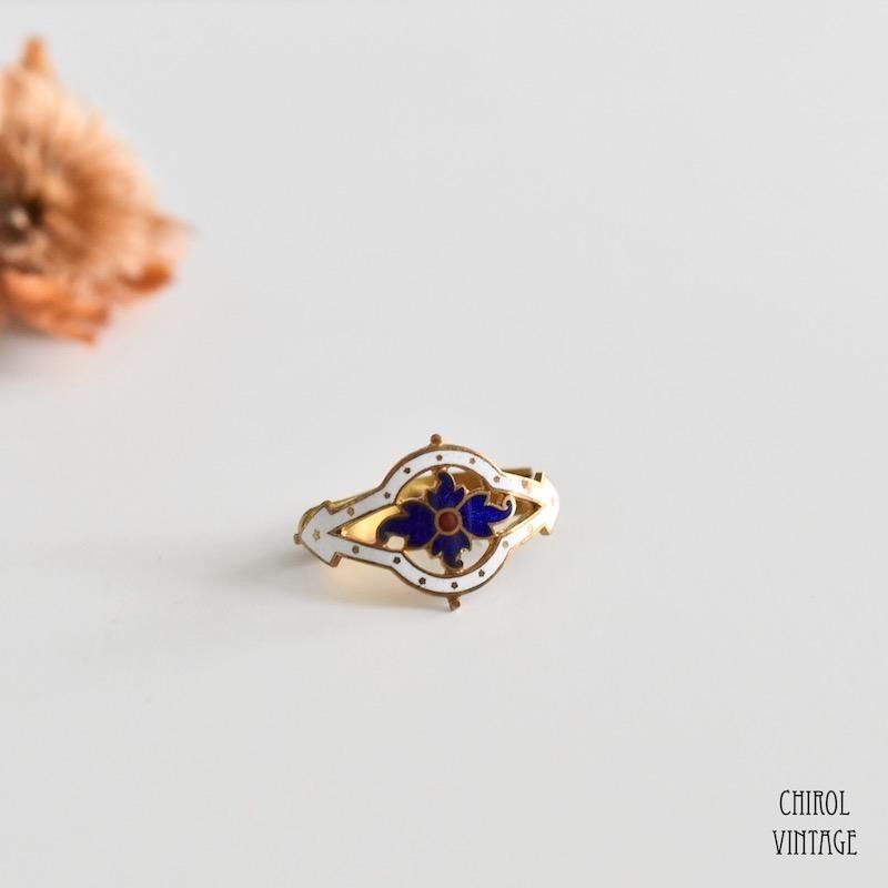 ホワイトのフレームのセンターに鮮やかなネイビーのフラワーがデザインされた、エナメルのアンティークスカーフリング。