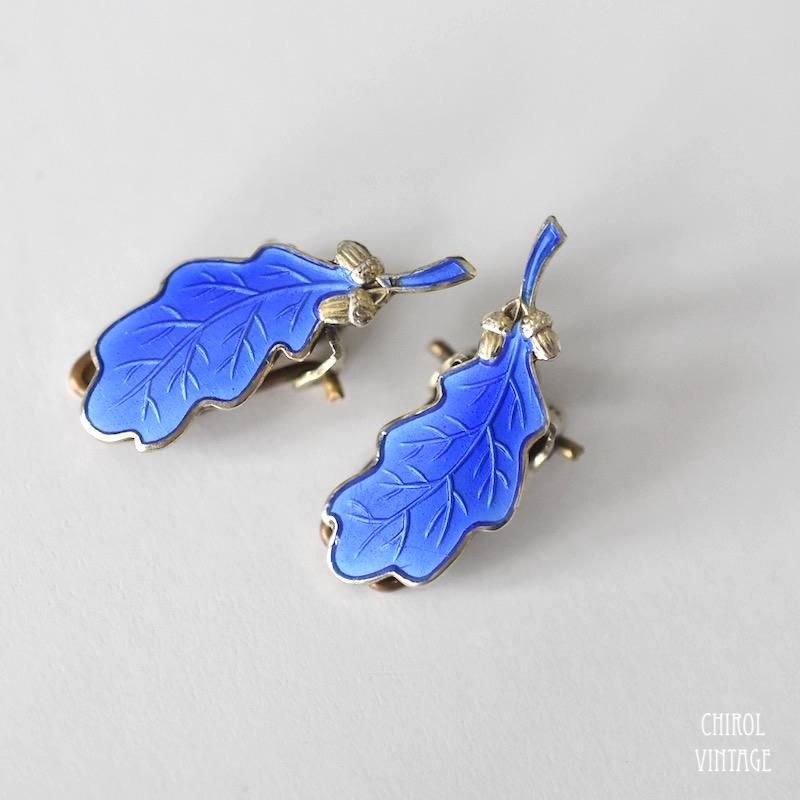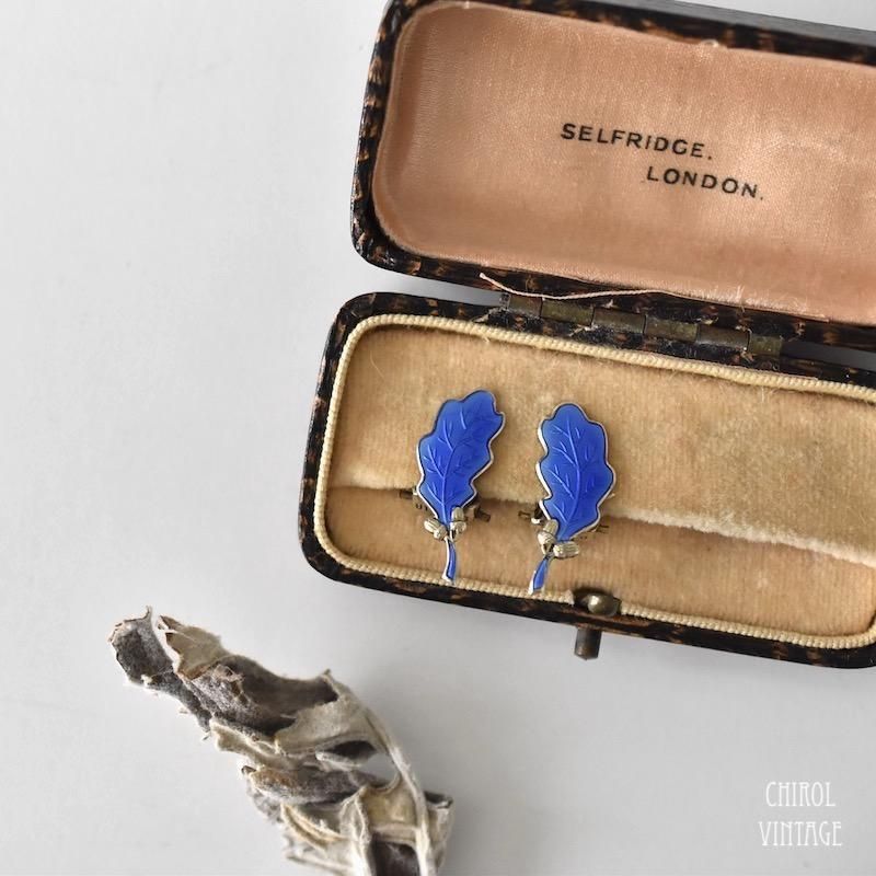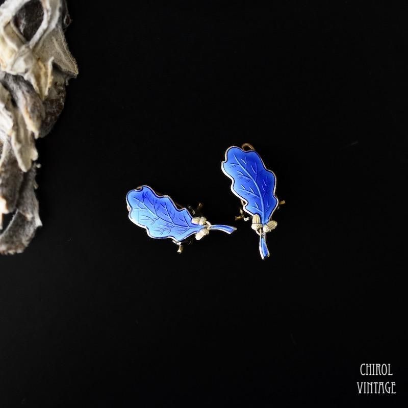 ブルーエナメル どんぐりxリーフ シルバーイヤリング