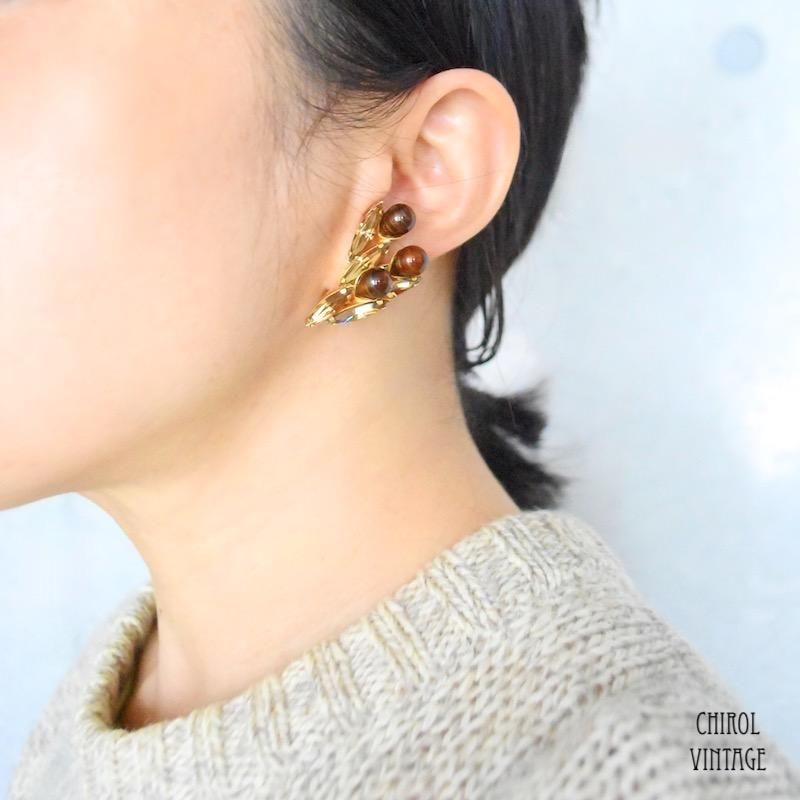 輝きの良いペールブラウンのマーキスビジューがランダムにクラスターし、その先にはタイガーズアイを模したペアシェイプのグラスがセットされたデザイン。