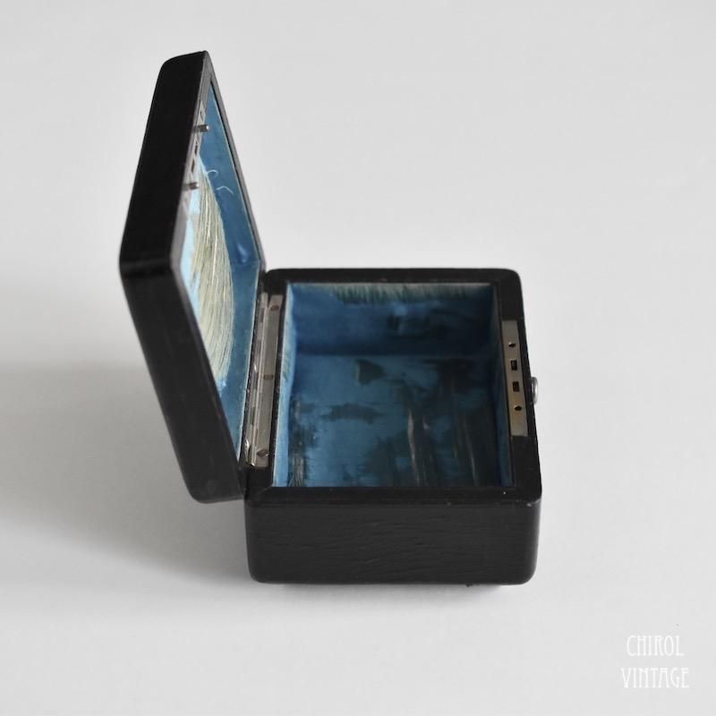 表面は艶やかな質感の良いブラックレザーで覆われ、蓋を開けるとブルーのシルクサテンのインテリアが良い雰囲気。