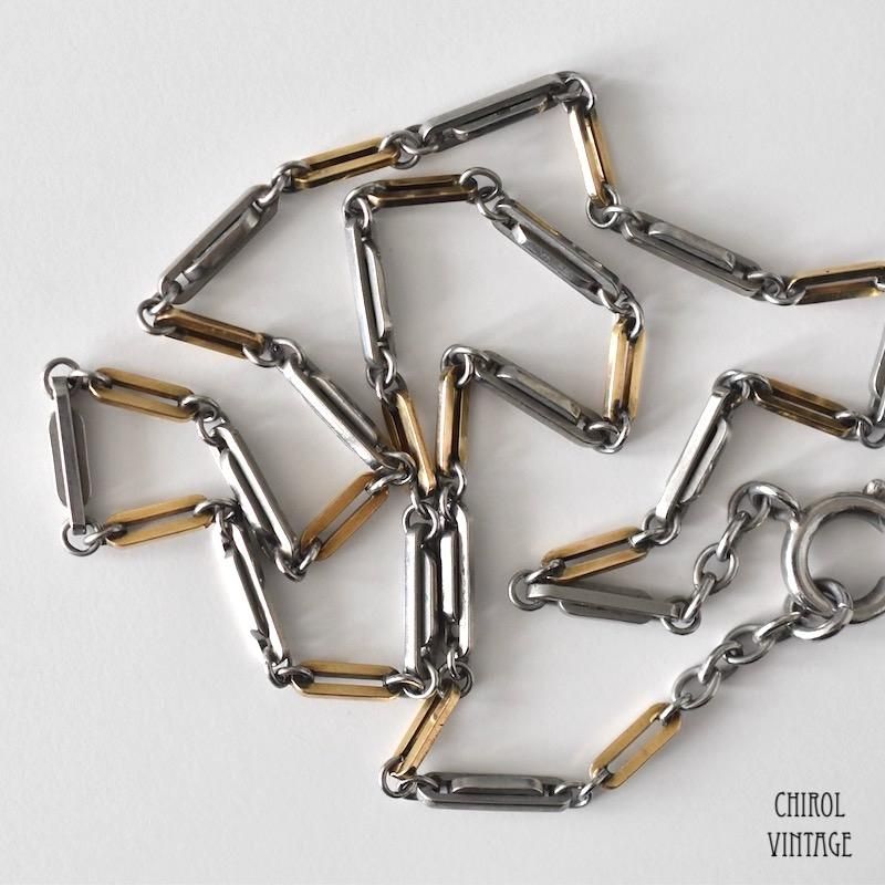 立体的なシルバートーンのリンクとオーバルのゴールドリンクが交互に連なった、デコレティブなアンティークチェーン。