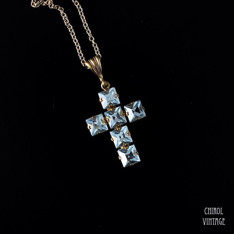 みずみずしく発光するような輝きを放つ、ペールブルーグラスのクロスペンダントネックレス。