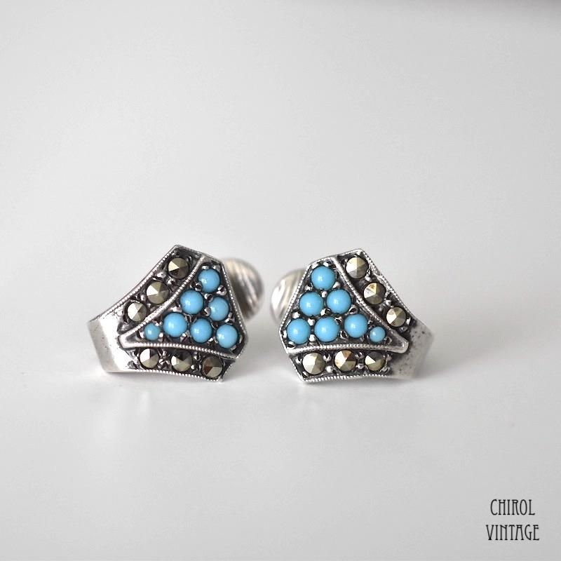 フランス ターコイズグラスxマーカサイト アールデコモチーフシルバーイヤリング