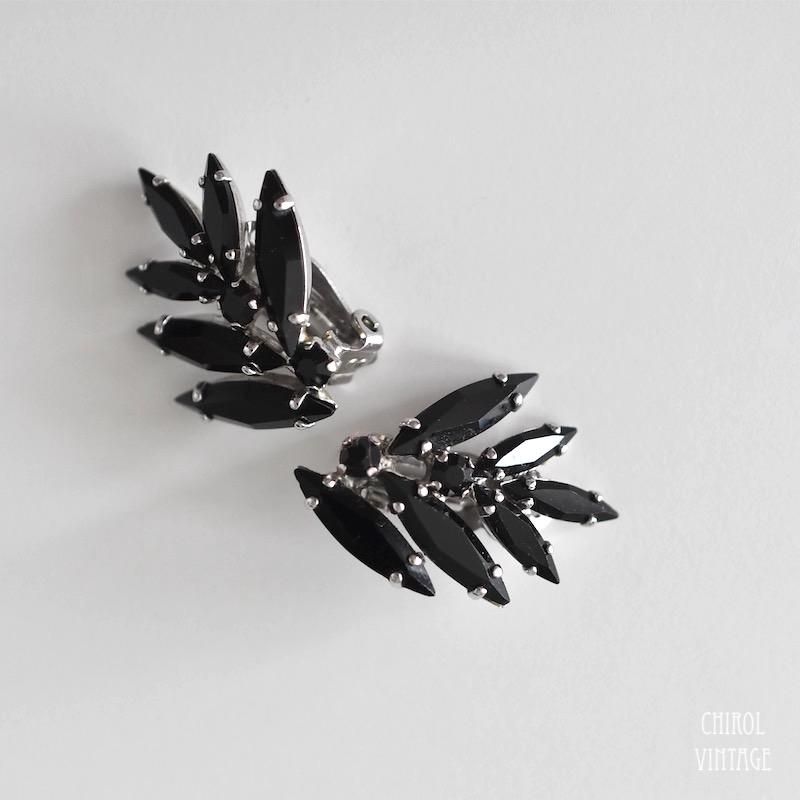 ブラックのマーキスビジューが一枚のリーフのようにアレンジされたヴィンテージクリップイヤリング。