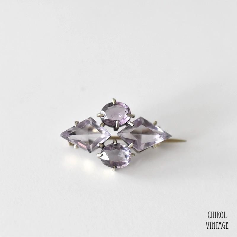 アシンメトリーなダイヤとオーバルのアメジストが並び、ひし形のシェイプにクラスターした個性的なデザインのブローチ。