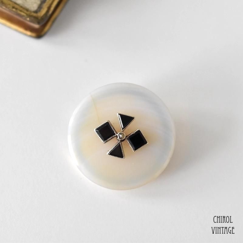 センターにはスクエアとトライアングルのオニキスでクロスのようなモチーフが形成され、小さなシードパールが一石セットされています。