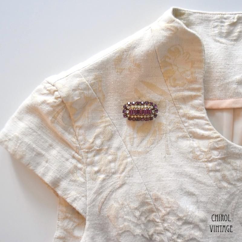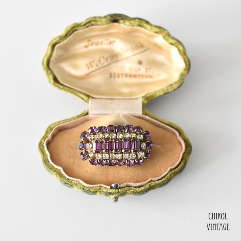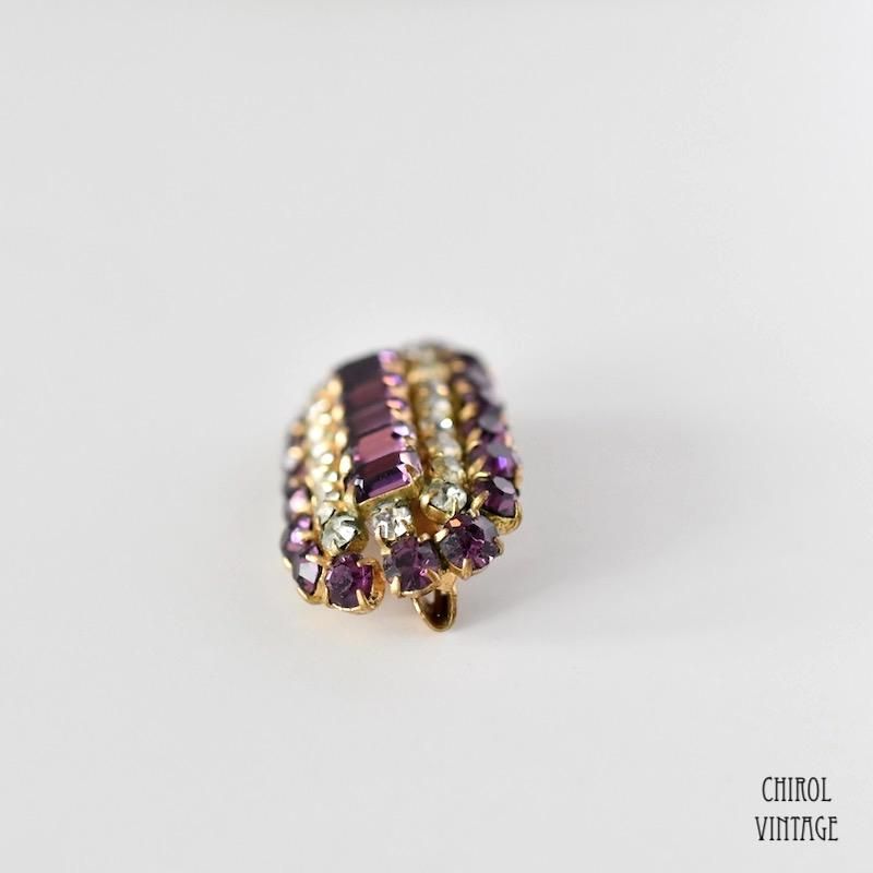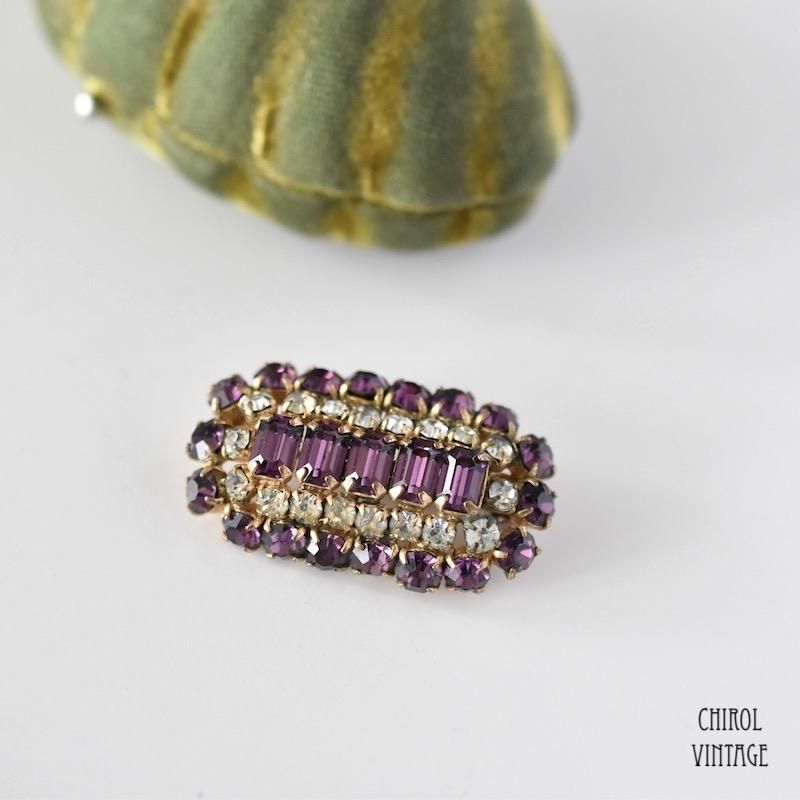 パープルとクリアのグラスがレクタングルのドーム状にクラスターした、ありそうで見ないデザインのブローチ。