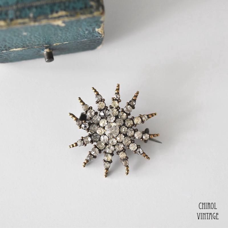 アンティークのクリアグラスが散りばめられたサンバーストのブローチ。